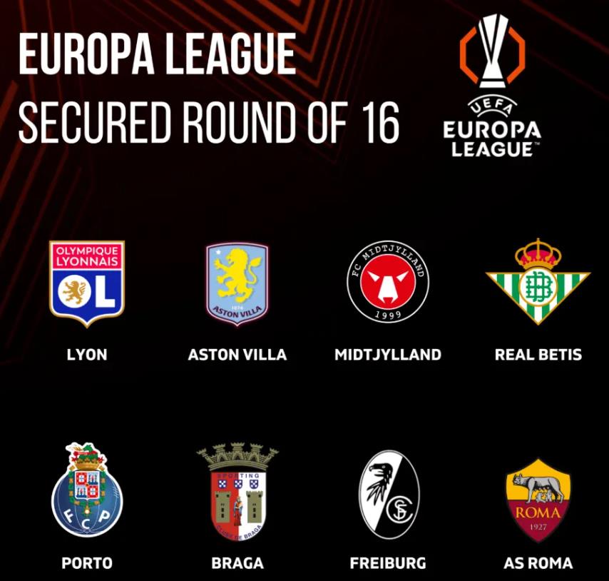 其中,贝蒂斯和波尔图均在联赛阶段的8轮赛事当中拿到了5胜2平1负的成绩而中日德兰则是6胜1平1负。此外,布拉加、弗赖堡与罗马也均赶上了直通的末班车,其中罗马在战绩方面为5胜1平2负,积16分。需要提到的是,在规则当中提到了积分榜前八切直通16强的俱乐部,在淘汰赛阶段的1/8决赛当中将会在对阵当中先客后主,意味着在后续比赛当中依然存在主客场方面的优势。