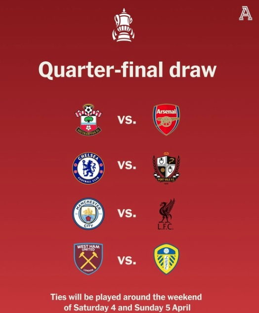 英足总杯1/8决赛最后一场比赛,在西汉姆联点球大战中以5-3击败布伦特福德下结束,对此,英格兰足总杯八强阵容正式尘埃落定,分别是切尔西、维尔港、曼彻斯特城、利物浦、南安普敦、阿森纳、西汉姆联和利兹联。随后抽签仪式顺利落幕,八强对阵及赛程时间同步公布,英足总杯八强将在北京时间4月4日打响。